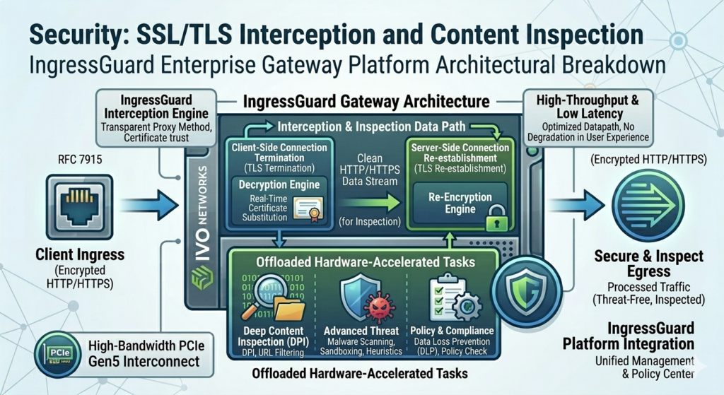 Breaking down the architecture of SSL/TLS interception in gateway appliances — how IngressGuard performs real-time certificate substitution, content inspection, and threat detection on encrypted HTTP/HTTPS traffic without degrading user experience or throughput.